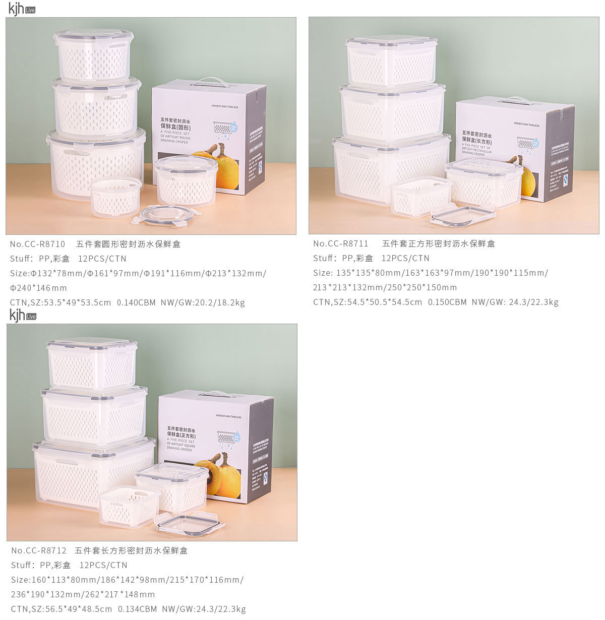 五件套圓形/正方形/長方形密封瀝水保鮮盒