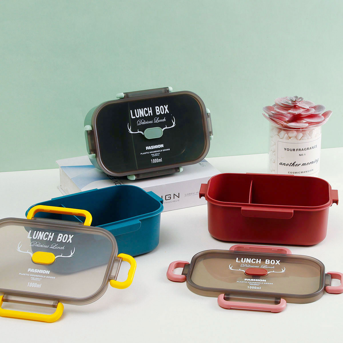 長方單層分格密封飯盒(1000ml)+圓形/八角隨行杯(500ml)
