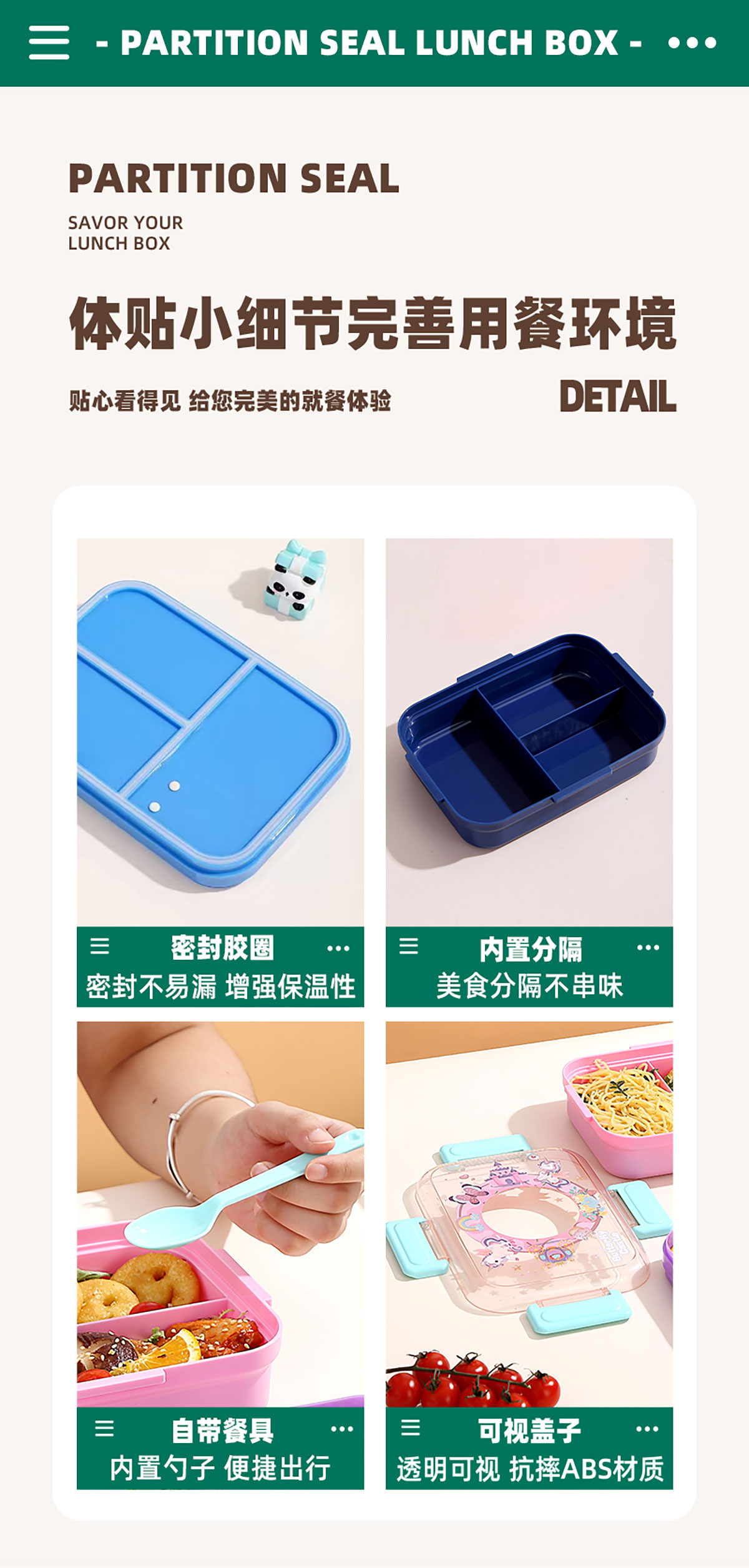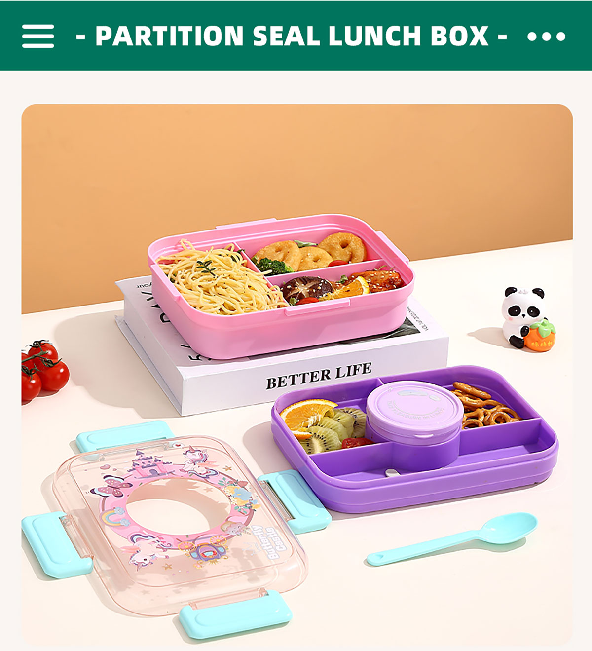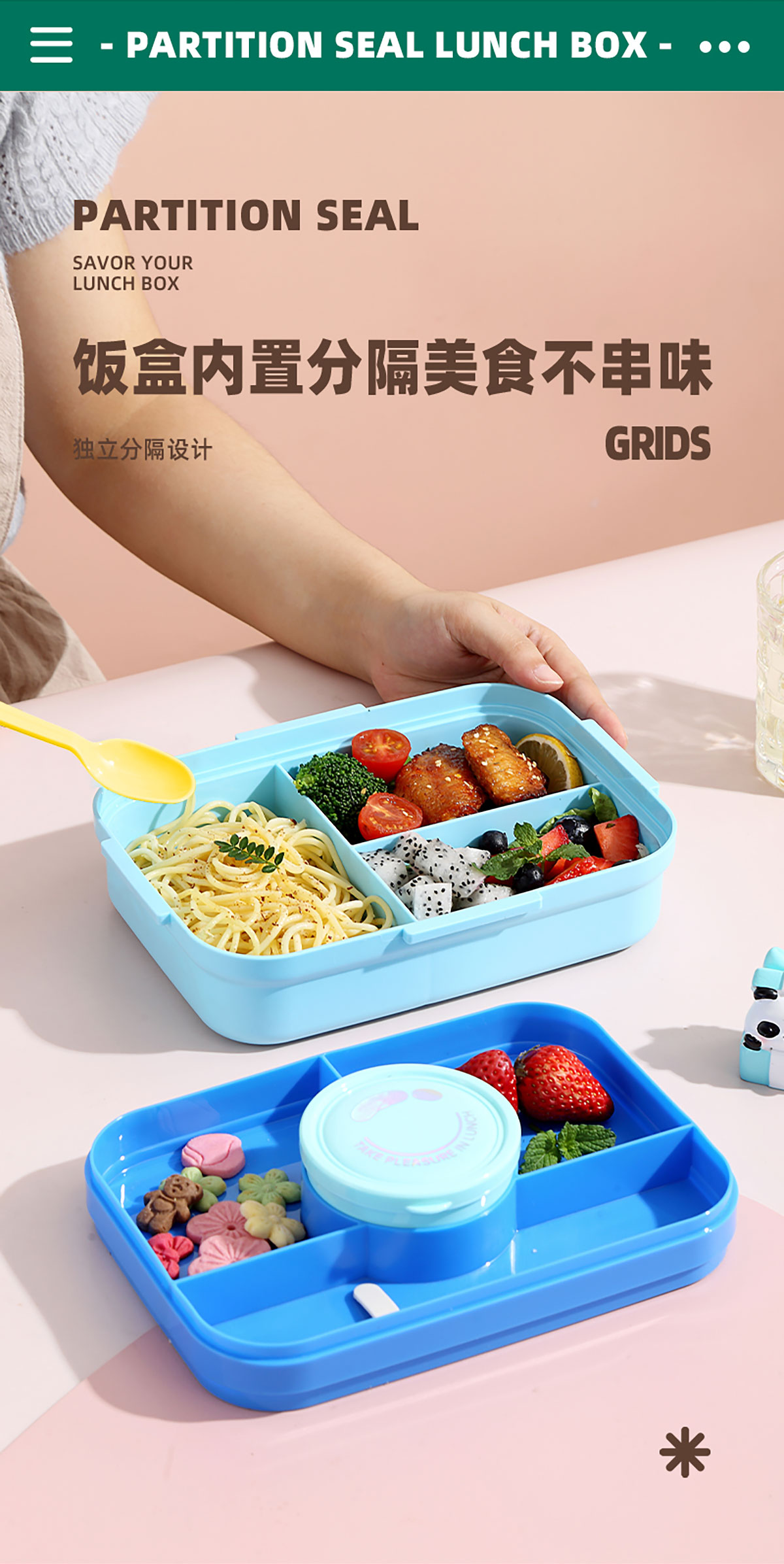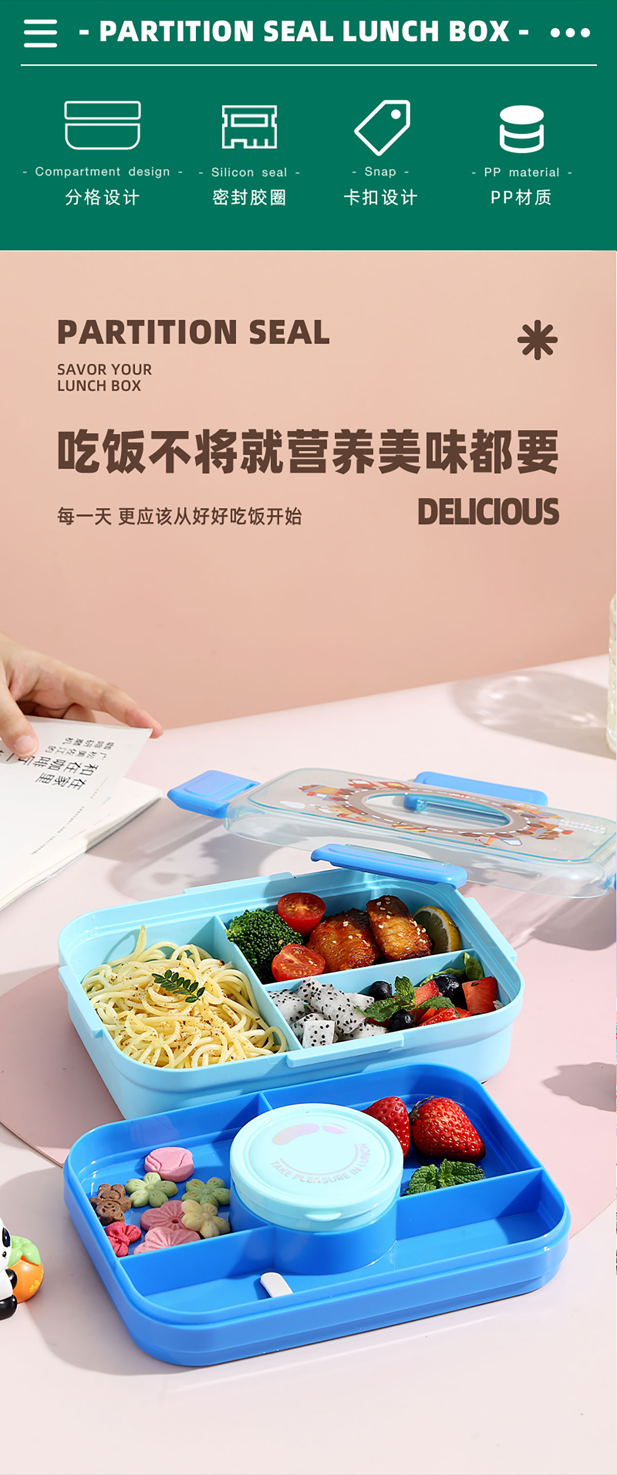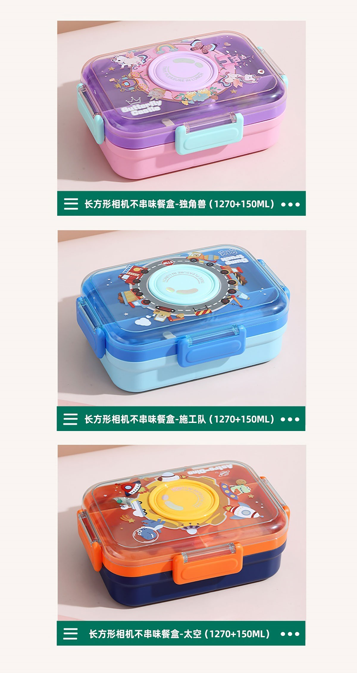 相機(jī)不串味餐盒(長方形塑料三格1270ml+碗150ml+PP勺)