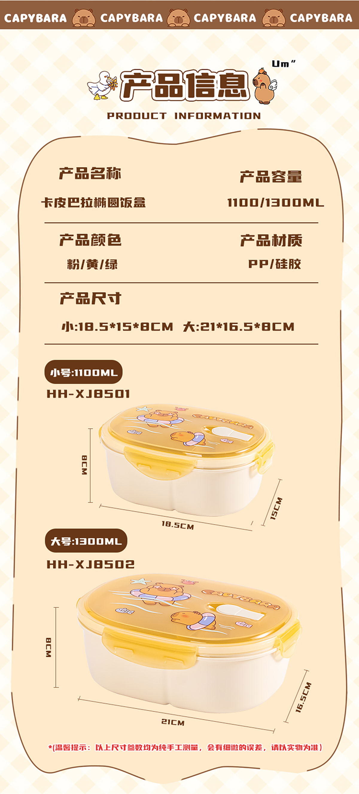 Size: HH-XJ8501(小號):192*152*80mm/1100ml HH-XJ8502(大號):210*170*77mm/1300ml